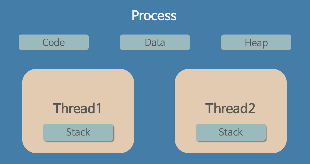 - 스레드는 프로세스 내에서 Stack만 각각 따로 할당받고 Code, Data, Heap 영역은 공유한다.