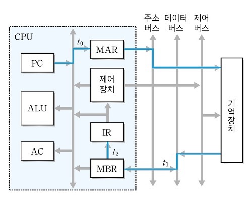 - 메모리에 저장된 데이터 값을 메모리 버퍼 레지스터(MBR)에 저장한다.