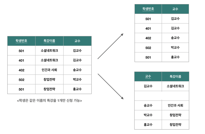 - 학생번호-교수 릴레이션은 함수 종속 관계가 성립하지 않는 동등한 학생번호, 교수 속성으로 구성하고 {학생번호, 교수}가 기본키의 역할을 담당한다. 즉, 후보키가 아닌 결정자가 존재하지 않기때문에 BCNF에 속한다.