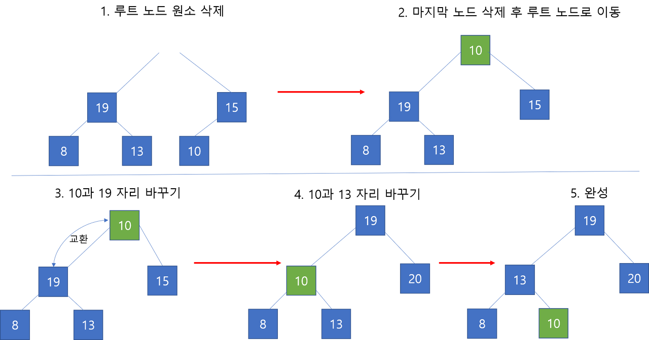 그림으로 보면 아래와 같은 과정을 거친다. (최대 힙의 삭제 과정)