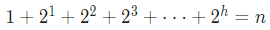 완전 이진 트리의 모든 노드가 존재한다고 했을 때 높이를 h라고 하고 노드의 개수를 n이라고 하면 다음이 성립한다.