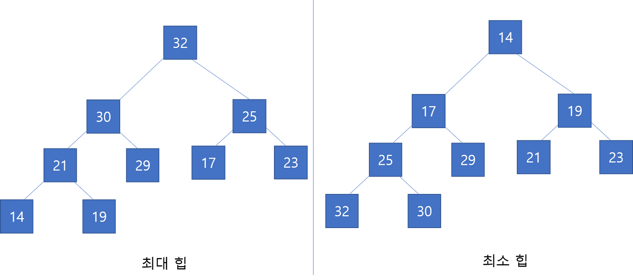 아래 그림은 최대 힙과 최소 힙의 예시이다.