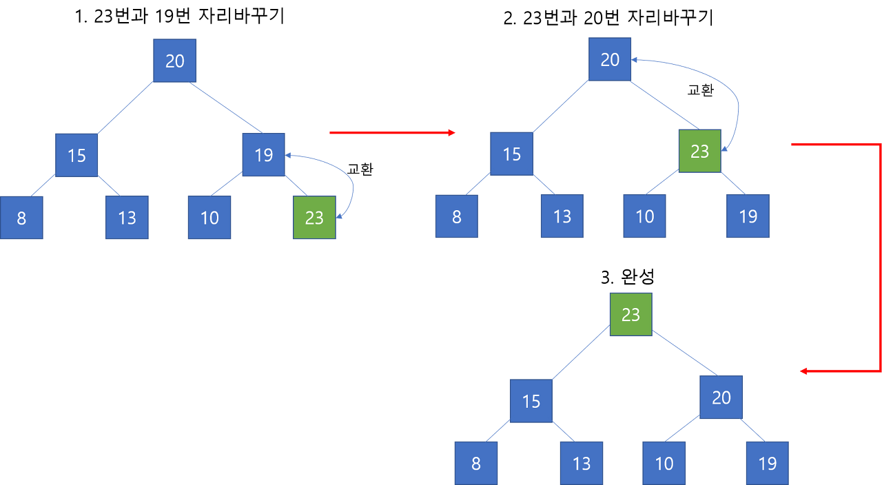 - 새로운 노드를 부모 노드들과 교환해 힙의 성질을 만족시킨다.