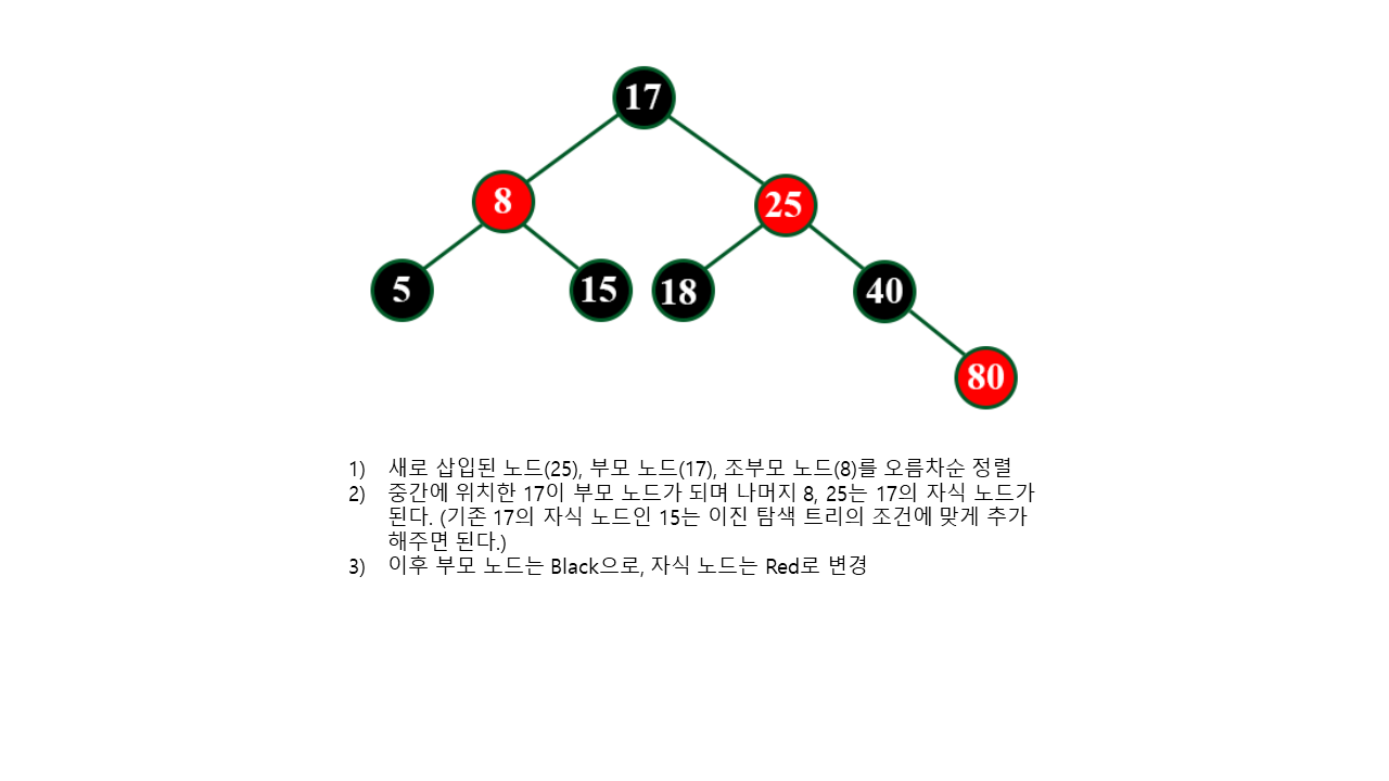 - 새로 삽입된 노드의 부모 노드, 삼촌 노드를 Black으로 하고 조부모 노드를 Red로 한다.