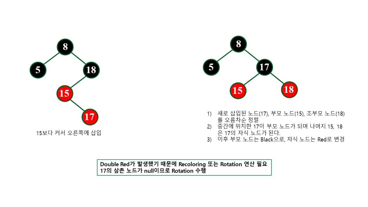 - 조부모 노드가 루트 노드가 아니라면 Double Red가 다시 발생할 수 있다.