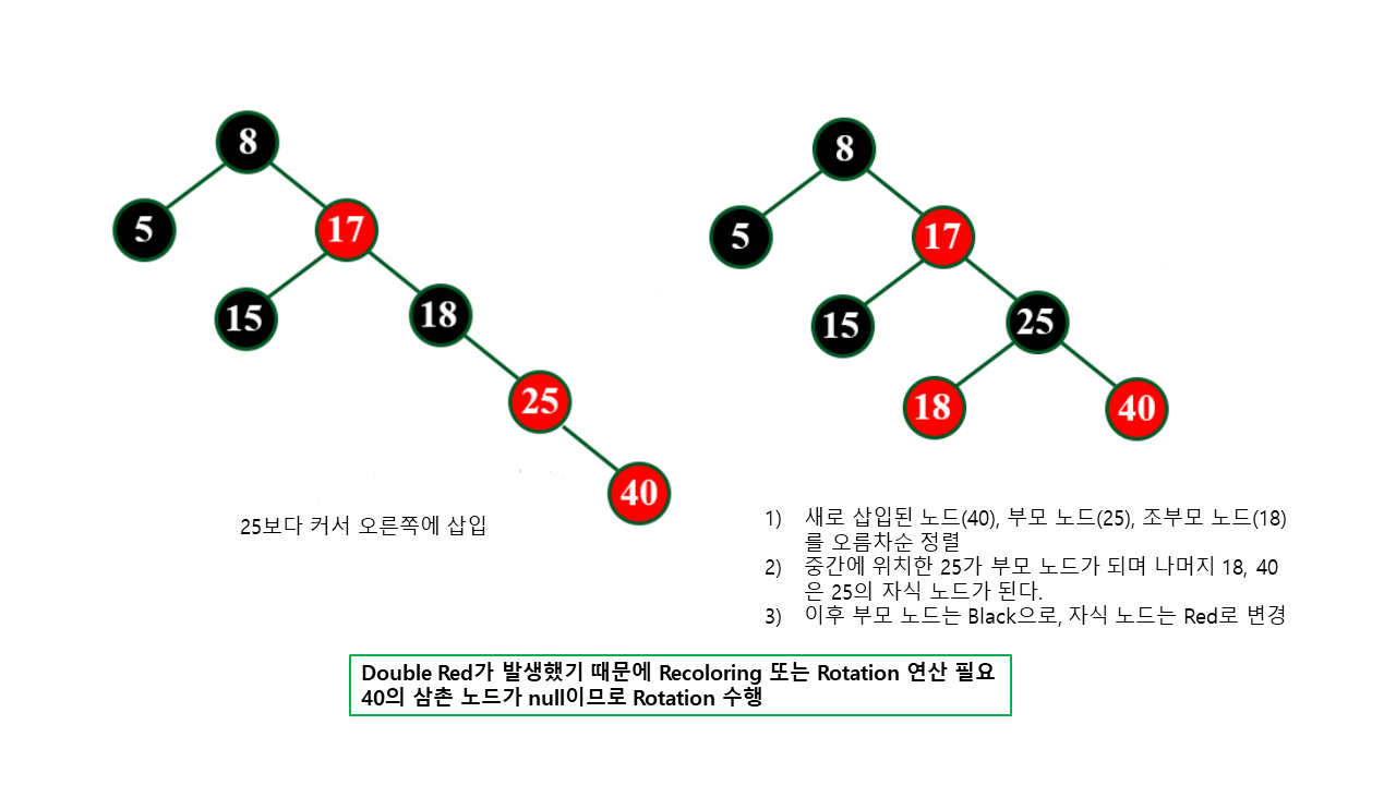 - 위와 같은 상황이 발생하면 그때 다시 Recoloring 또는 Rotation 연산을 수행한다.