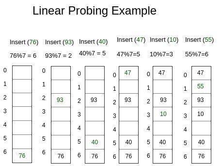 - 선형 탐색(Linear Probing): 다음 해시나 n개를 건너뛰어 비어있는 해시 에 데이터를 저장