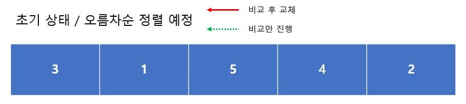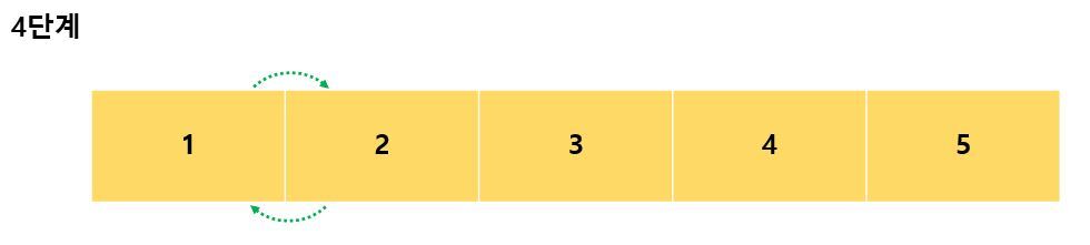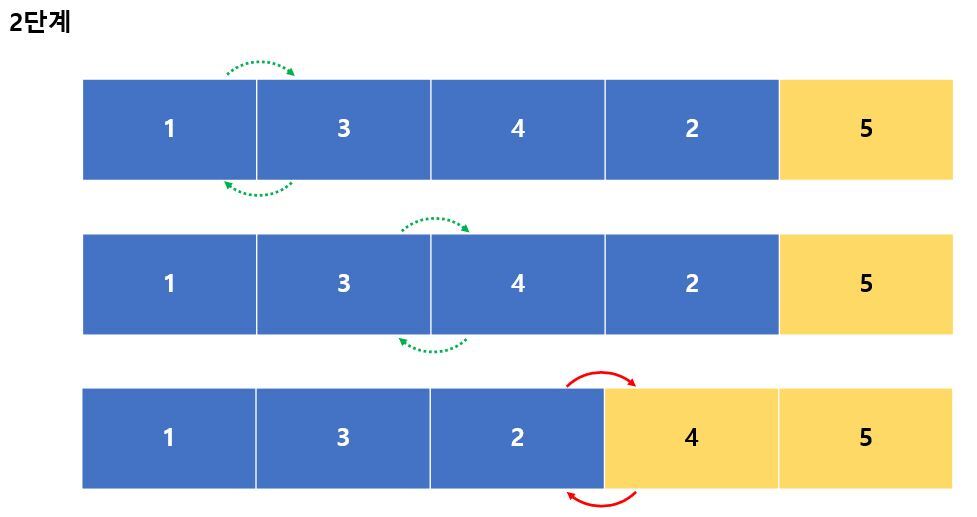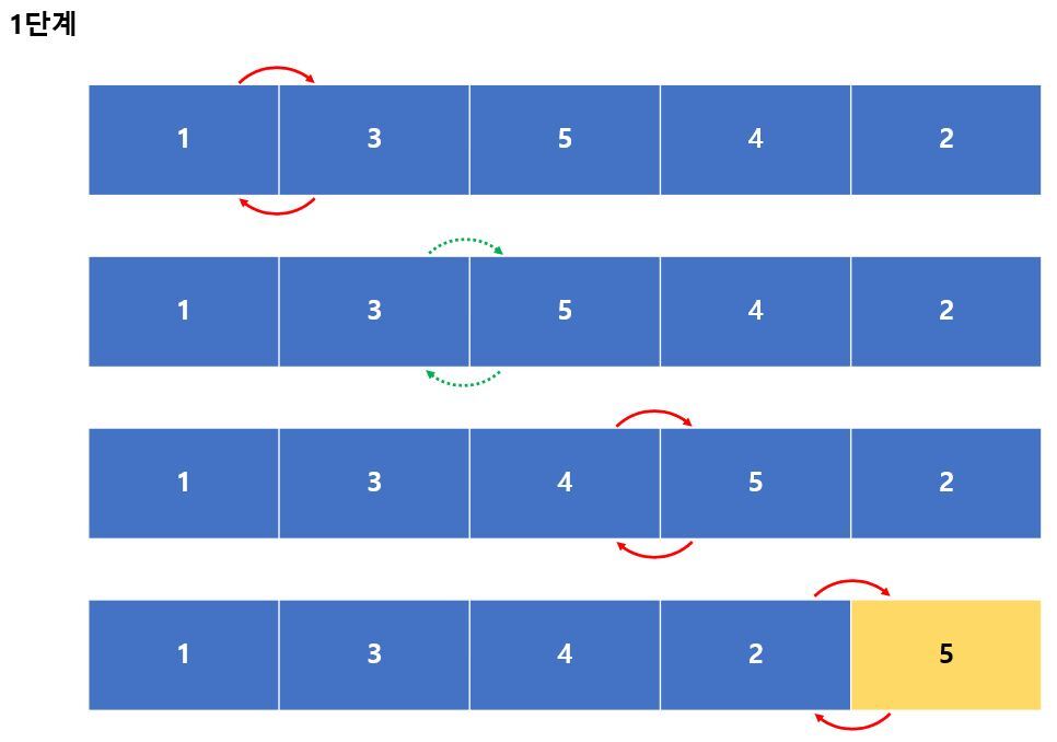 위 그림에서 확인할 수 있듯이, 5개의 요소를 거품 정렬을 적용해서 정렬하면