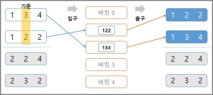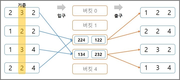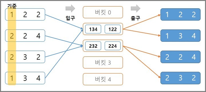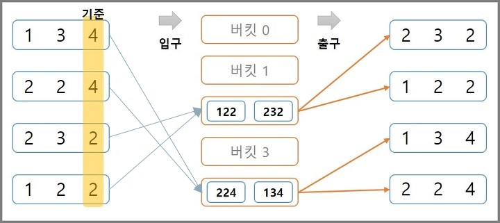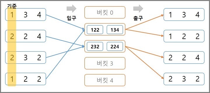 나쁜 예시) [4562,12,651,-1123],[blue, yellow, red] - 정렬 대상의 자리수를 기준으로 '버킷'이라는 공간에 '큐(Queue)' 방식으로 저장 후 다시 꺼낸다