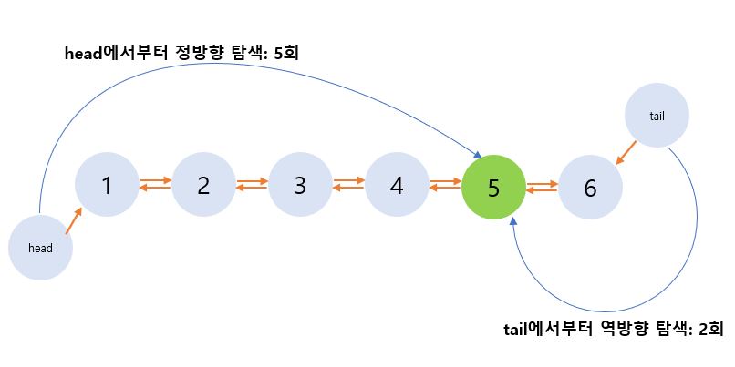 단순 연결리스트에서는 최악의 경우 n번의 탐색을 해야하지만, 이중 연결리스트에서는 얻고자 하는 데이터의 위치가 tail에 가깝다면 tail에서 부터 역방향으로 탐색이 가능하기 때문에 탐색 시간을 줄일 수 있다.