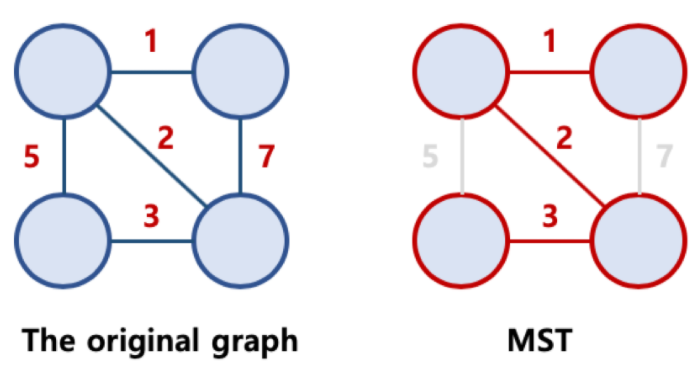 원래 그래프의 모든 노드가 연결되어 있으면서, 트리의 속성을 만족하는 그래프