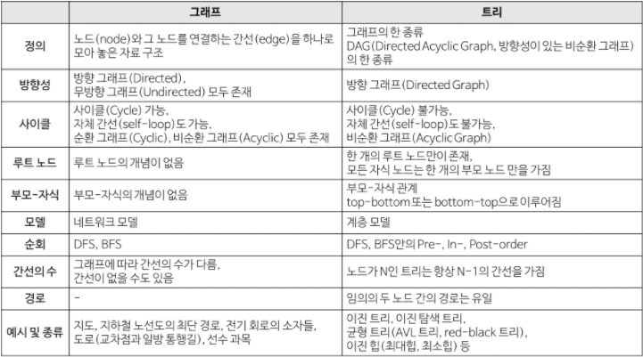 그래프와 트리의 차이점에 대해서는 아래의 표로 좀 더 자세하게 설명하겠다.